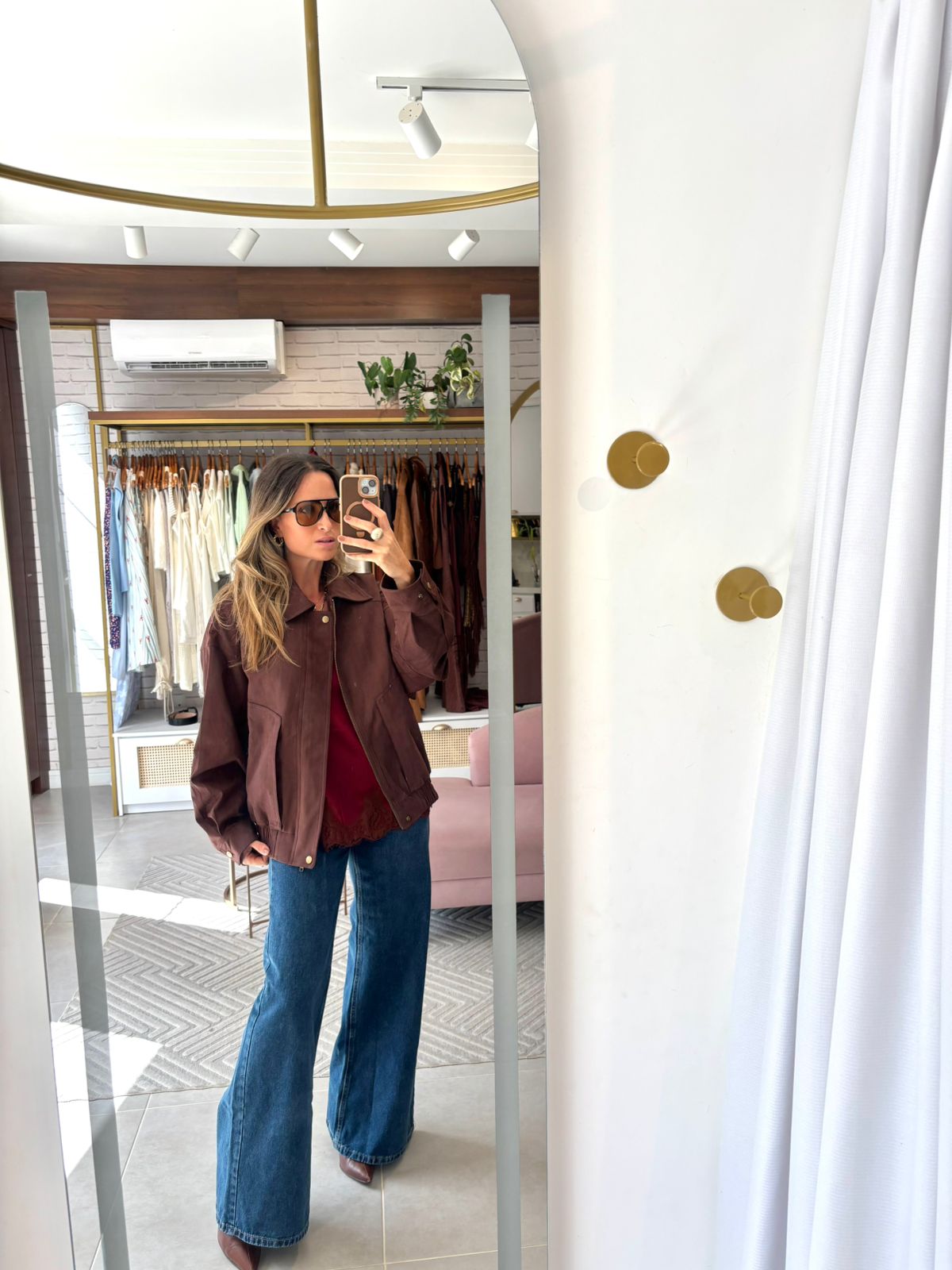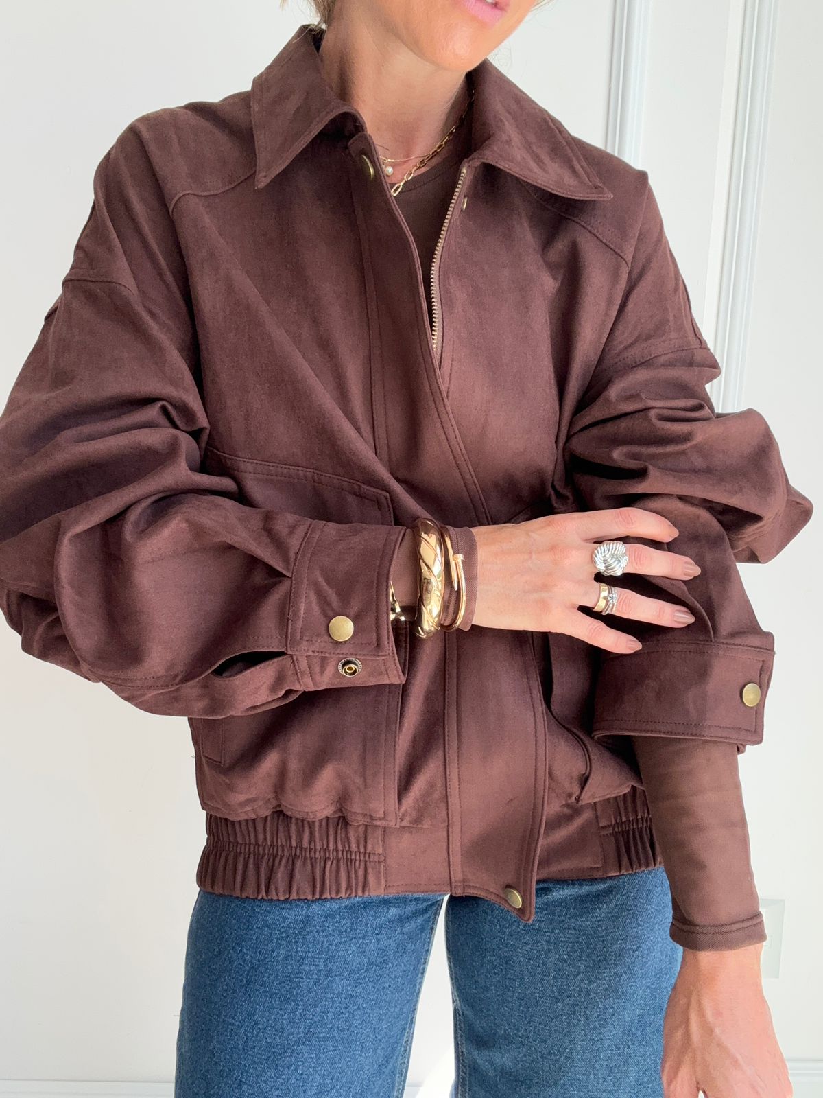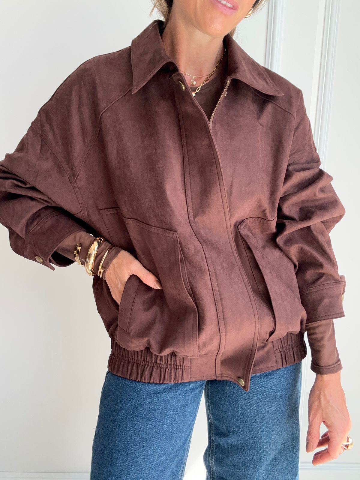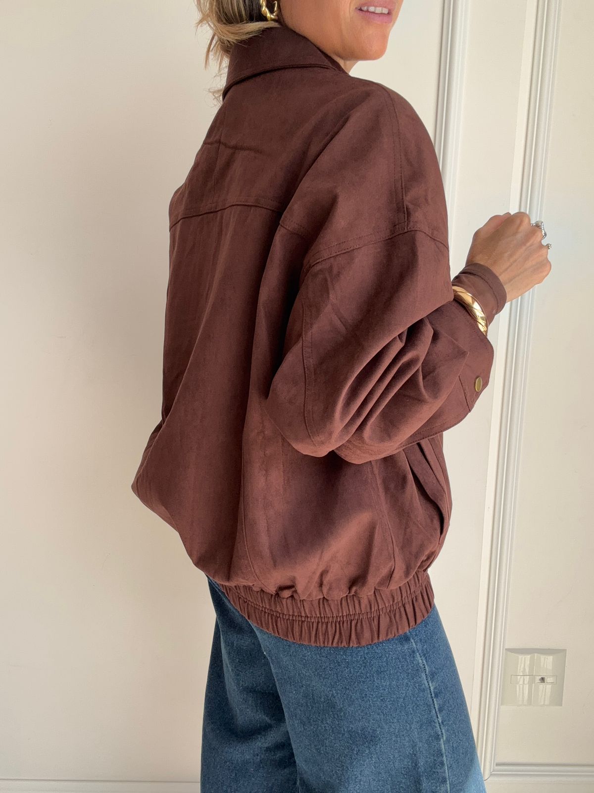 Jaqueta estilo bomber confeccionada em camurça, com toque macio e visual sofisticado. O modelo possui fechamento frontal com zíper coberto por vista com botões de pressão, garantindo um acabamento mais elegante e protegido. Conta com punhos ajustáveis com botão de pressão e barra com elástico, que proporcionam melhor ajuste ao corpo. Possui dois bolsos laterais funcionais, trazendo praticidade para o dia a dia.