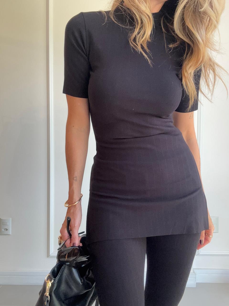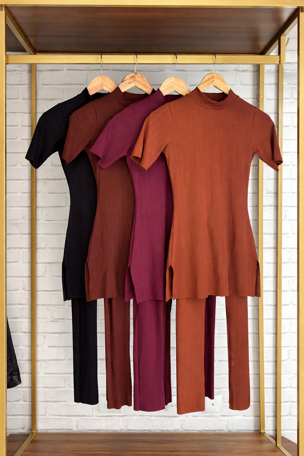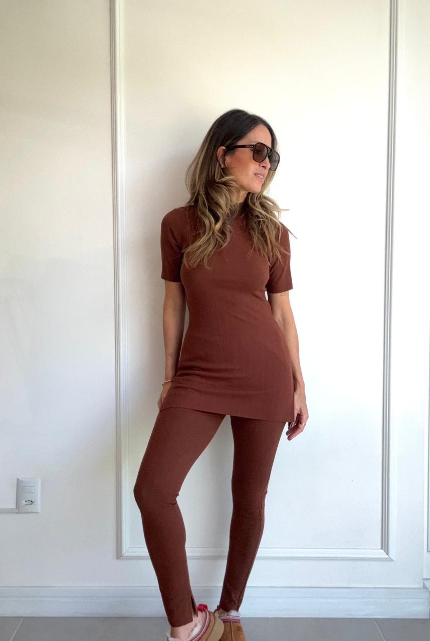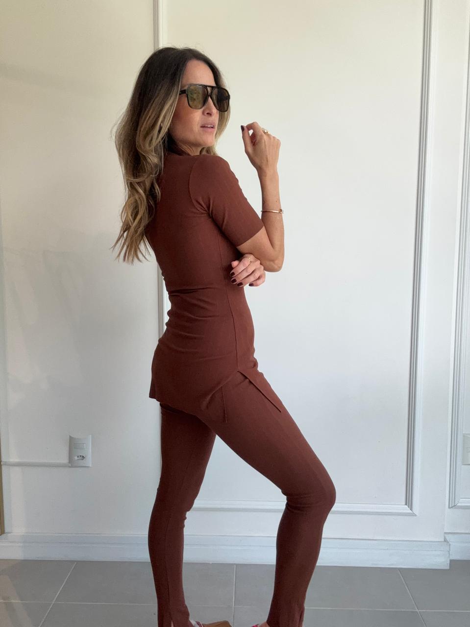 Conjunto em malha Dream com modelagem ajustada ao corpo, composto por blusa e calça estilo fuseau. Tanto a blusa quanto a calça possuem acabamento a fio, trazendo um visual moderno e despojado. A blusa tem comprimento alongado, meia manga e gola alta, além de fendas laterais na altura do quadril, que garantem mais conforto e movimento. A calça segue o estilo fuseau, com modelagem skinny, cós largo com elástico para melhor encaixe ao corpo e bolsos laterais, unindo praticidade e estilo.